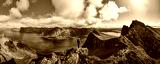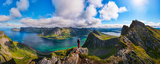 Hiker standing on the top of Husfjellet Mountain on Senja Island in northern Norway and enjoying spectacular views over surrounding fjords and mountains.