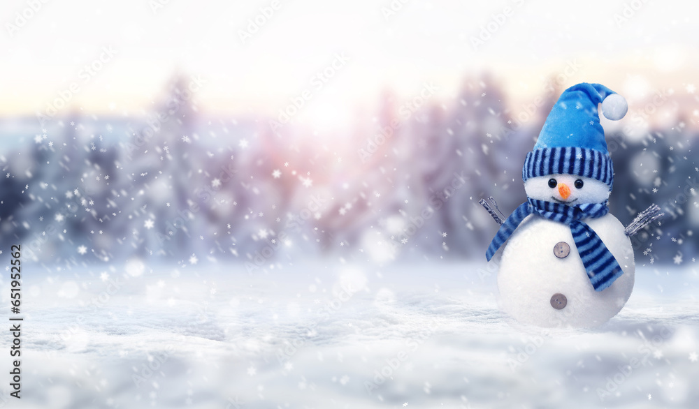 One little snowmen in caps on snow in the winter. Background with a funny snowman. Christmas card.