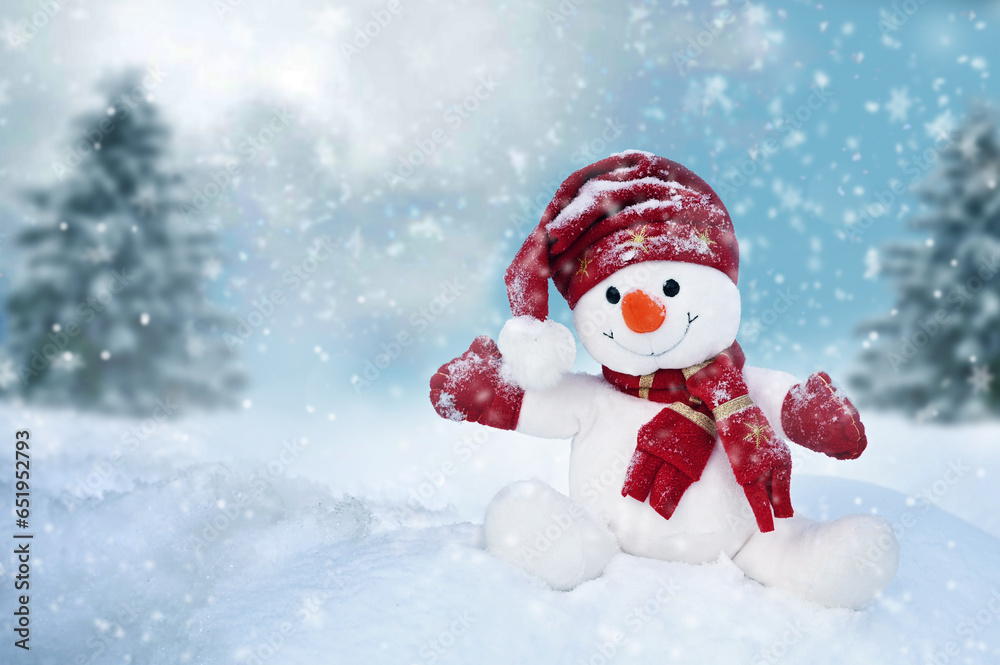 One little snowmen in caps on snow in the winter. Background with a funny snowman. Christmas card.