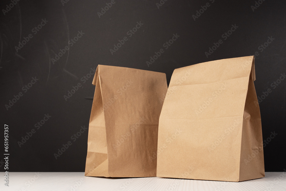 Lunch bag for school with a blank kraft packet on the background of the blackboard