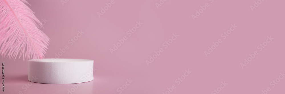 Feather and podium cosmetics mockup on pink background banner,lightness and sensitivity of spa and skincare