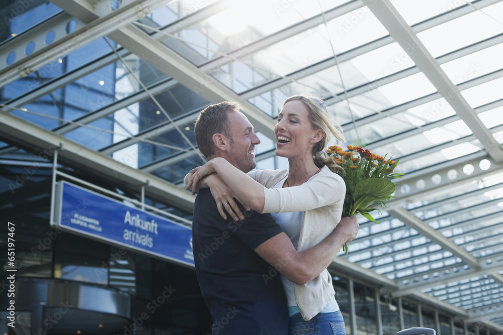 Deutschland,Leipzig -Halle,Flughafen,Paar umarmt,Mann hält Blumen