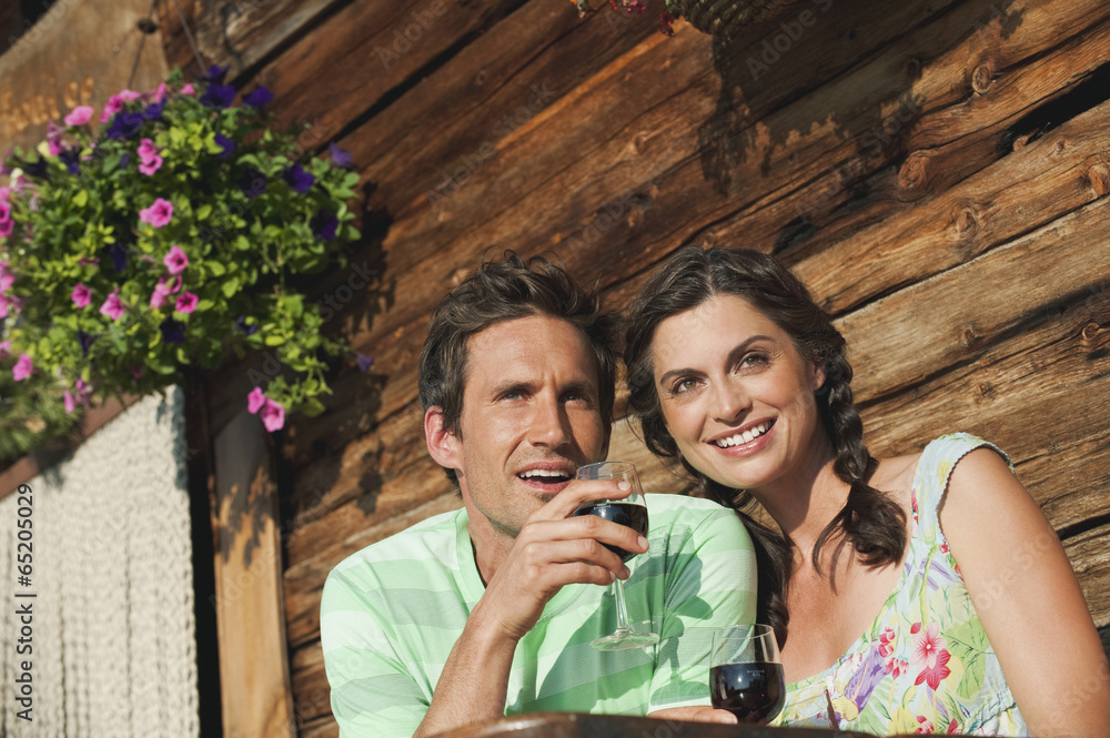 Italien,Südtirol,Paar vor der Blockhütte halten Weingläser,Lächeln,Portrait