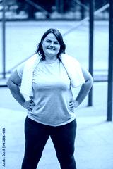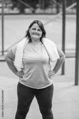 An oversized individual is portrayed here in sportswear, embodying the spirit of a sporty and fit lifestyle. This real person exudes confidence and happiness after their weight loss journey.