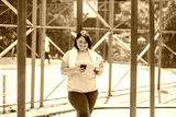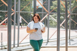 A female with a plus size, after training outdoors, checks her smartphone, radiating happiness and satisfaction. She holds a water bottle.