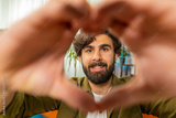 I love you. Happy middle eastern man at home living room couch makes symbol of love showing heart sign to camera express romantic feelings express sincere positive feelings. Charity gratitude donation