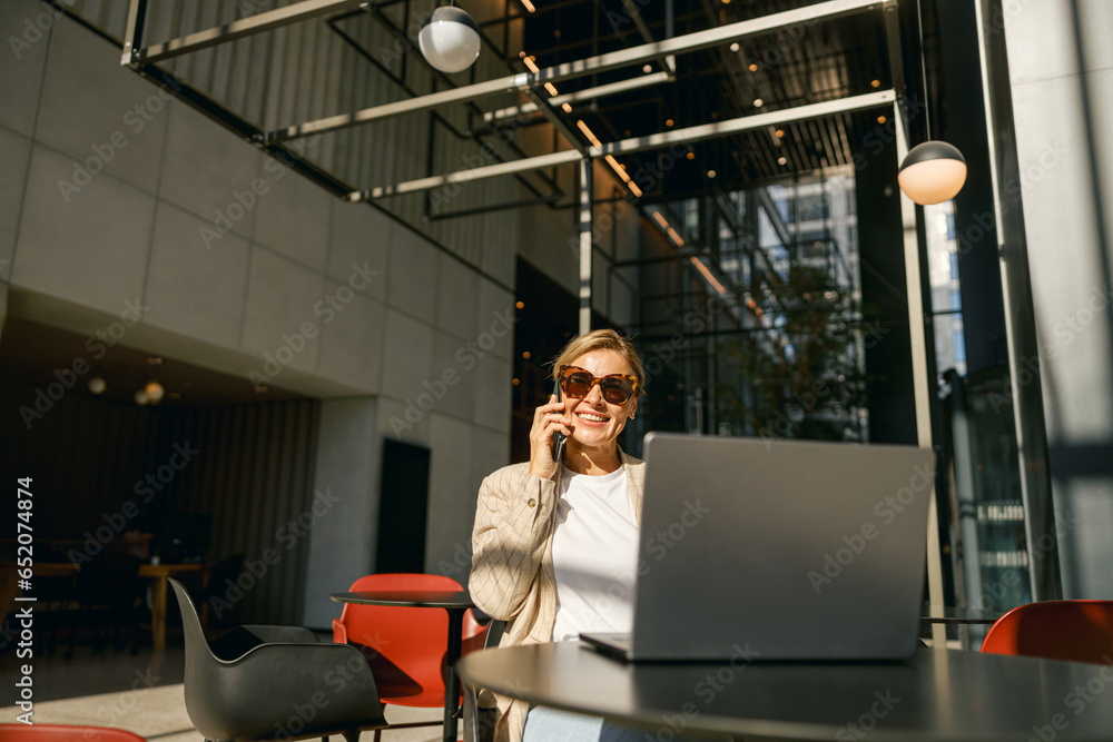 Businesswoman in eyeglasses talking on phone with client while working on laptop in office
