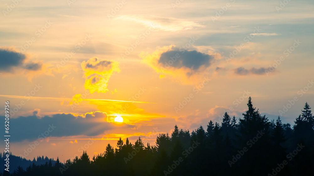 Colorful clouds in the sky at sunset against the backdrop of a mountainous forest area.