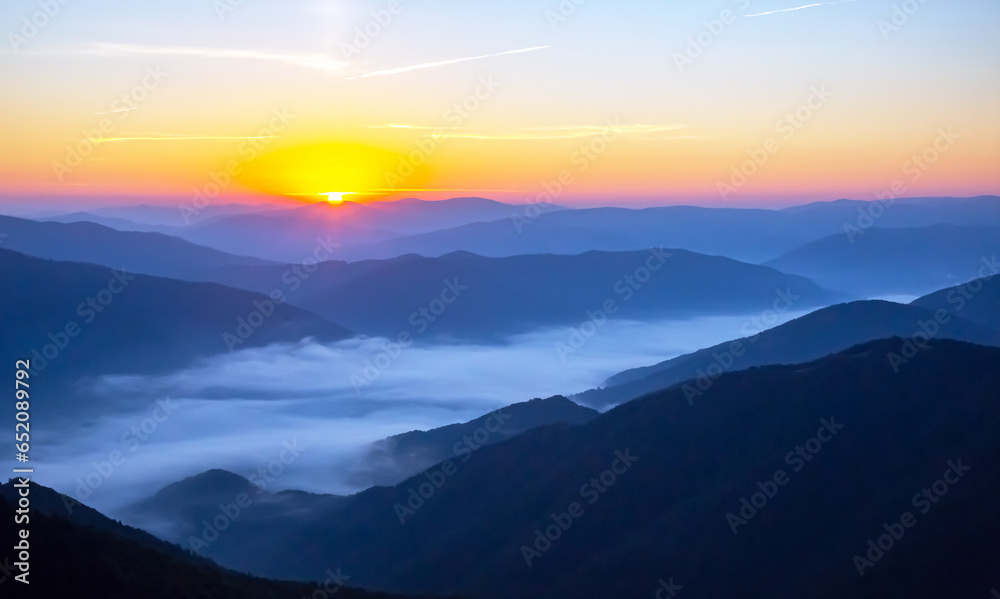 Morning dense fog in the mountainous forest area of the Ukrainian Carpathians. Landscape in nature. Dawn in the mountains