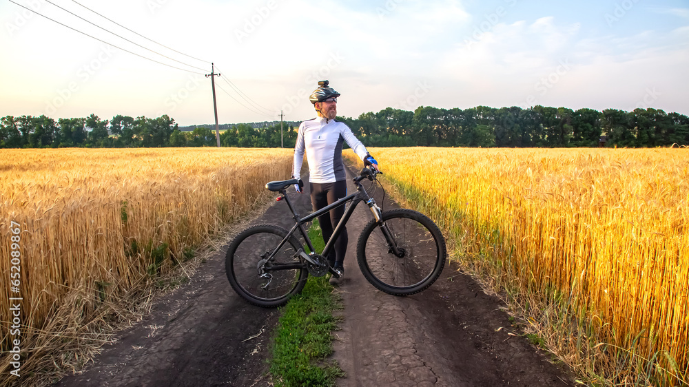 Bearded male cyclist is resting with a bike on the road in nature. cycling and health hobbies