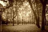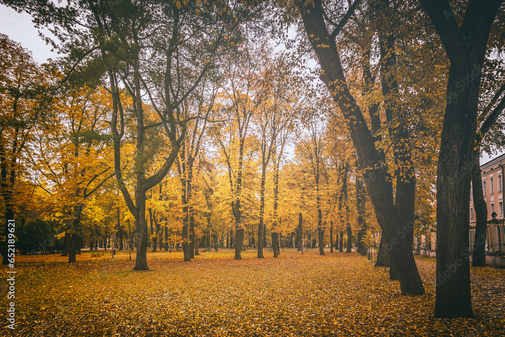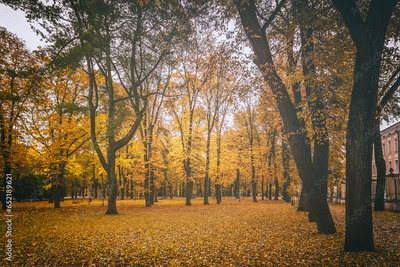 Golden autumn in a city park with trees and fallen leaves on a cloudy day. Vintage film aesthetic.