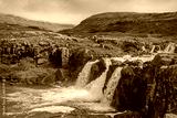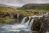three streams of whitewater form the Baejarfoss waterfall in the Dynjandi park in Iceland with tundra vegetation and a cloudy sky in the background