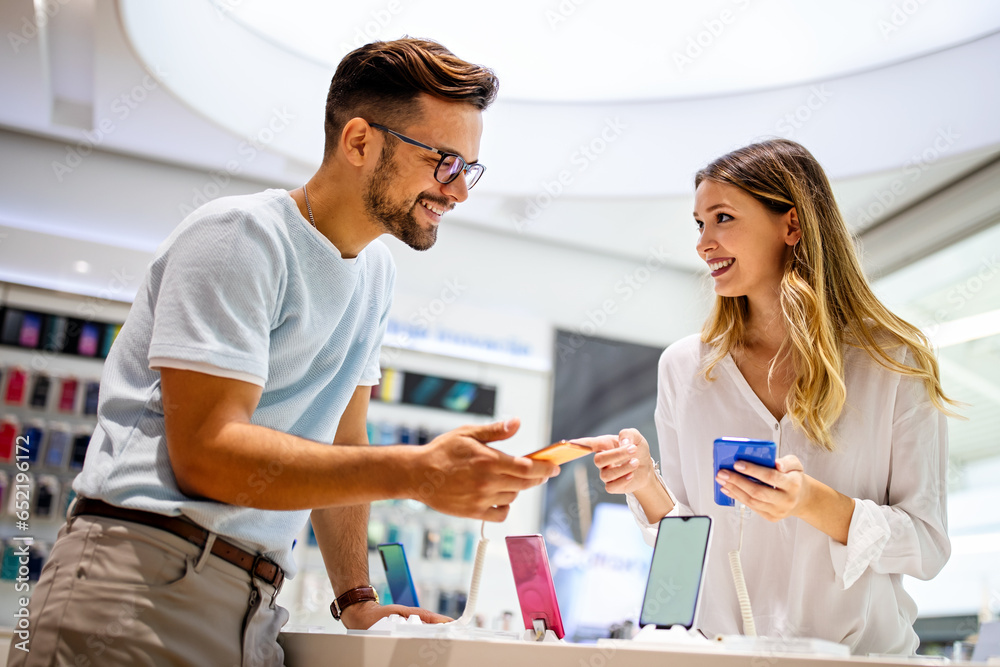 Young satisfied couple testing the new model of a smart cell phone from the desk in the tech store.
