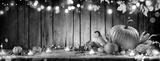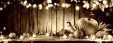 Thanksgiving - Pumpkins And Corncobs On Rustic Table With Garland And Defocused Abstract Lights