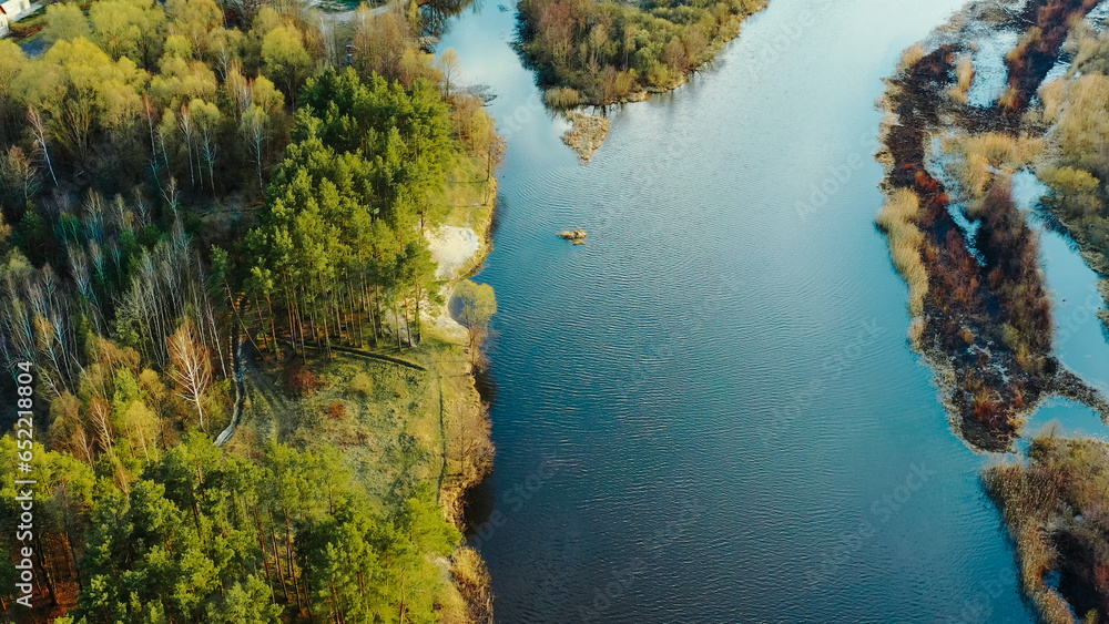 Aerial View Curved River In Early Spring Landscape. River bends and pine forest landscape. Top View Of Beautiful European Nature From High Attitude. Drone View. Bird's Eye View.