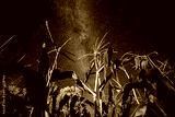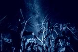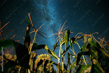 Bottom View Of Night Starry Sky With Milky Way From Green Maize Corn Field Plantation In Summer Agricultural Season. Amazing Night Stars Above Cornfield.
