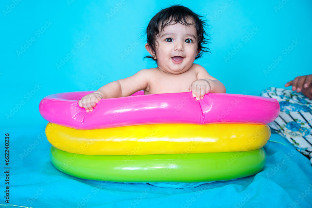 six months old cute indian baby boy sitting in colorful Inflatable air bathing tube isolated over blue studio background, Happy child with black hair.