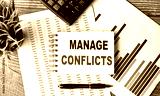 MANAGE CONFLICTS text on a notebook with chart and calculator