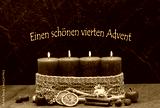Vierter Advent: Vier brennenden Kerze mit Weihnachtsdekoration vor dunkelm Hintergrund. Mit dem Text einen schönen vierten Advent.