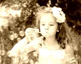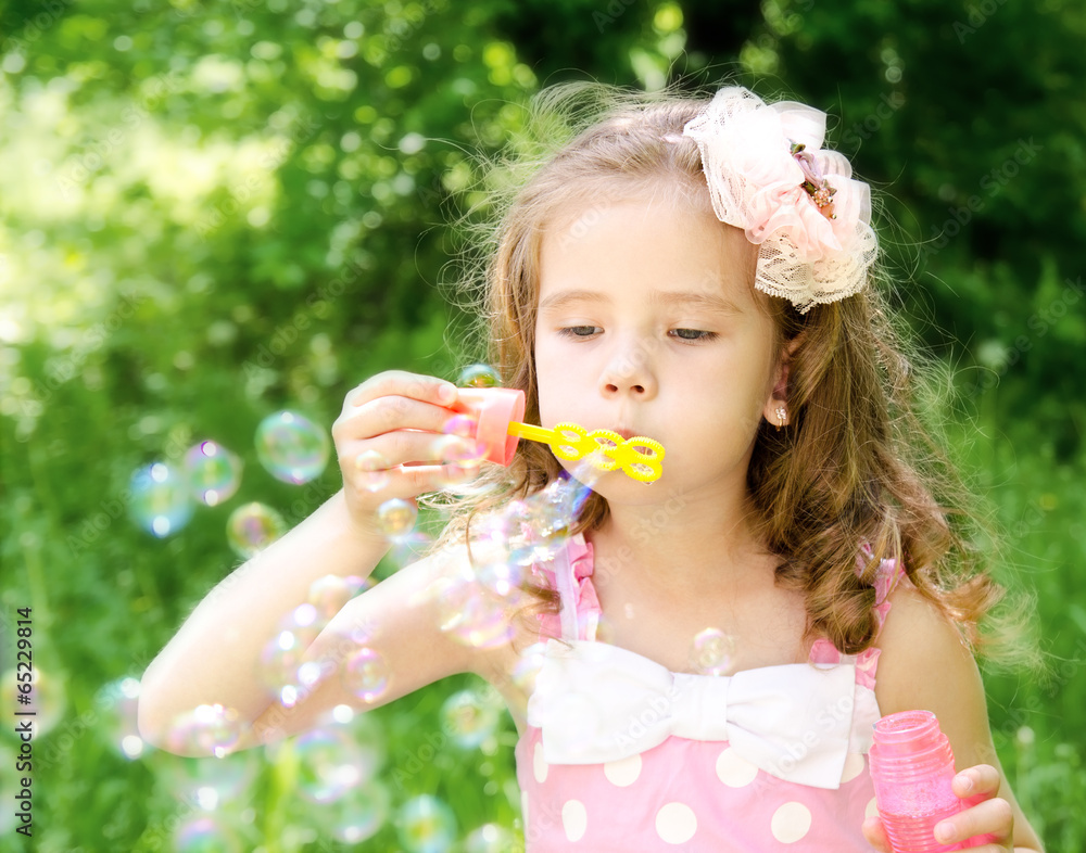 Cute little girl is blowing a soap bubbles