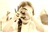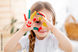 The child draws at home. Paint on the hands. Decorative and applied art for children. A little girl draws a bright picture. A creative child plays and learns.