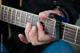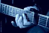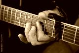 Close-up of a person playing guitar at a function, focusing on the hands and instrument.