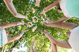 A bride and her bridesmaids tossing their bouquets in the air at a wedding. The bride is wearing a white wedding dress and holding a bouquet of white roses.
