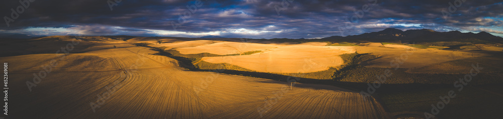 An aerial photo of harvested wheat fields in the Overberg region of South Africa with high contrast light