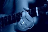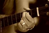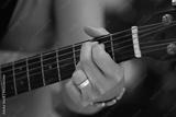 Close-up of a person playing guitar at a function, focusing on the hands and instrument.