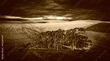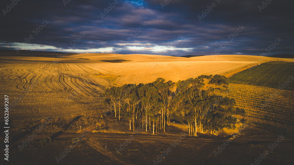 An aerial photo of harvested wheat fields in the Overberg region of South Africa with high contrast light