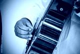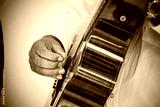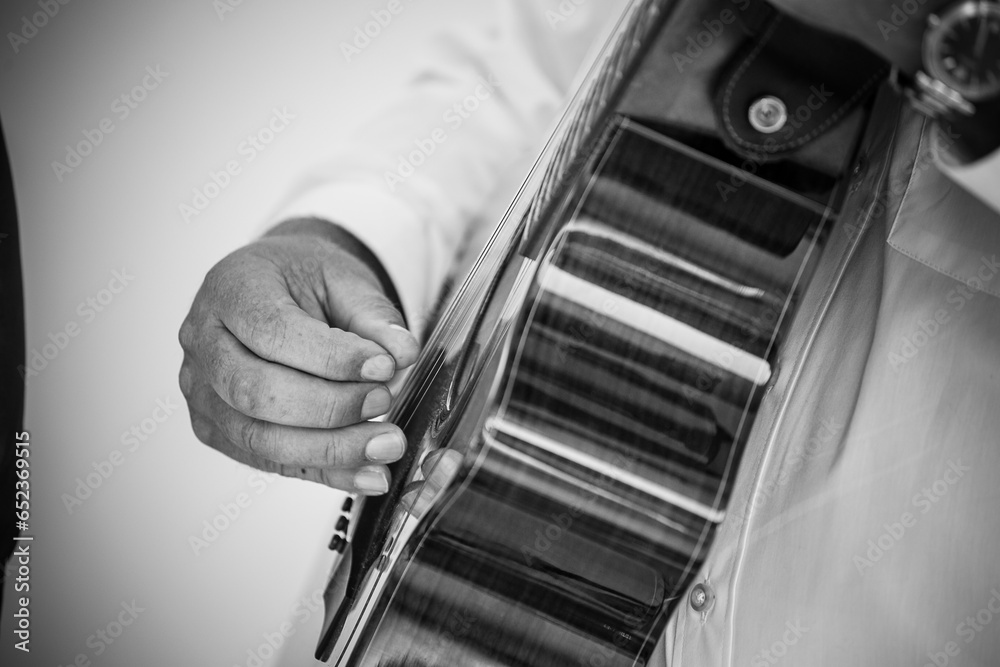 Close-up of a person playing guitar at a function, focusing on the hands and instrument.