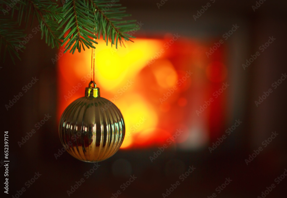 Christmas ball on fir tree branch and blur burning fireplace background.