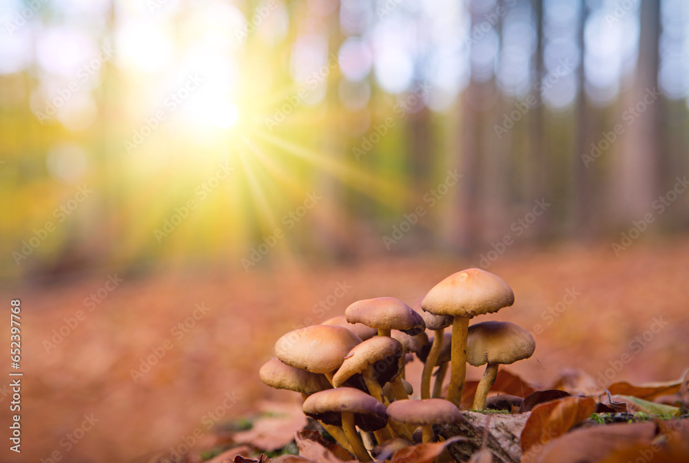 Autumn forest with bright sun and brown mushrooms.