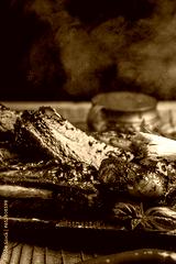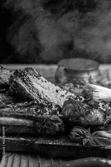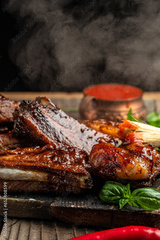 Hot grilled pork ribs with sauce and smoke on a wooden board. Restaurant menu, dieting, cookbook recipe