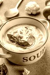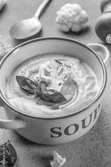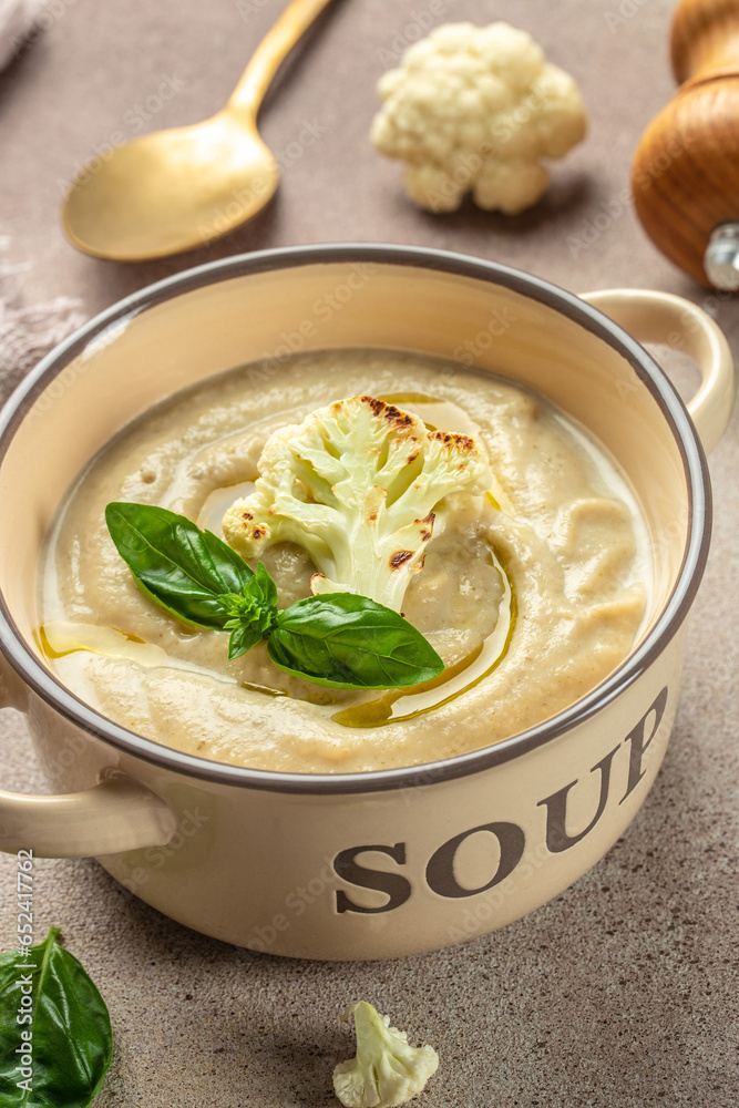 soup cauliflower puree in a bowl. vertical image. top view. place for text
