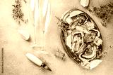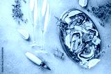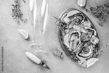 Opened oysters, ice and white wine. Restaurant menu, dieting, cookbook recipe top view