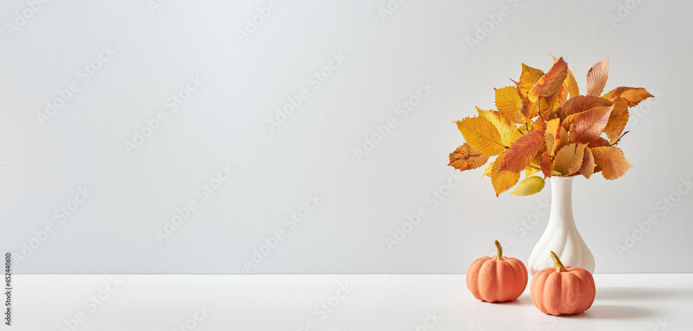 Home interior with decor elements. Colorful autumn leaves in a vase on a light background. Mock up for displaying works