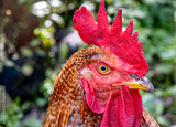 Head portrait of a brown free-range rooster outdoors, Gallus gallus domesticus