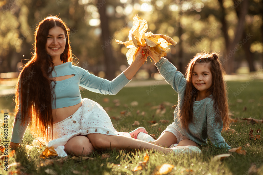 mother and daughter sitting on the grass in the park with yellow leaves in their hands at sunset. Autumn walk