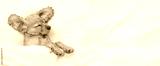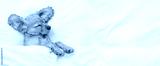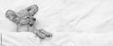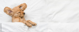 Eared English Cocker spaniel puppy sleeps on a bed at home. Top down view. Empty space for text