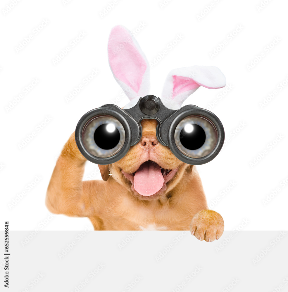 Happy puppy wearing easter rabbits ears looks through binoculars above empty white banner. Isolated on white background