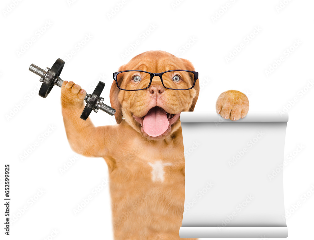 Smart Mastiff puppy lifts dumbbells and shows empty list. isolated on white background