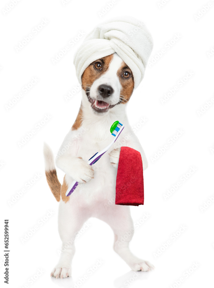 Jack russell terrier puppy with towel on it head holds toothbrush with toothpaste. isolated on white background