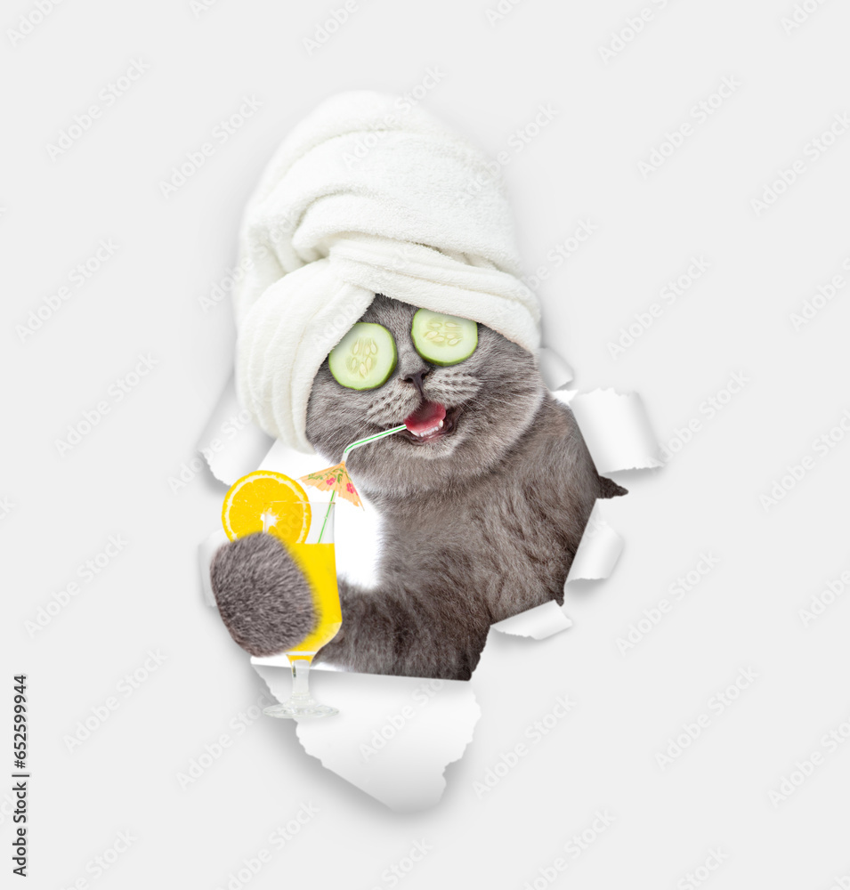 Happy kitten with towel on it head and with pieces of cucumber on it eyes holds brush, looks through a hole in white paper and holds tropic cocktail