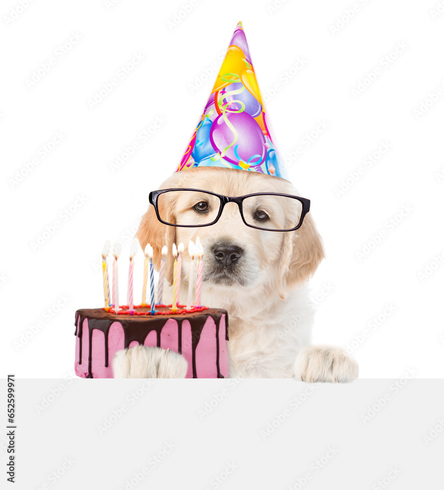 Golden retriever puppy wearing party cap and eyeglasses looks above empty white banner and shows birthday cake with burning candles. isolated on white background