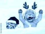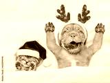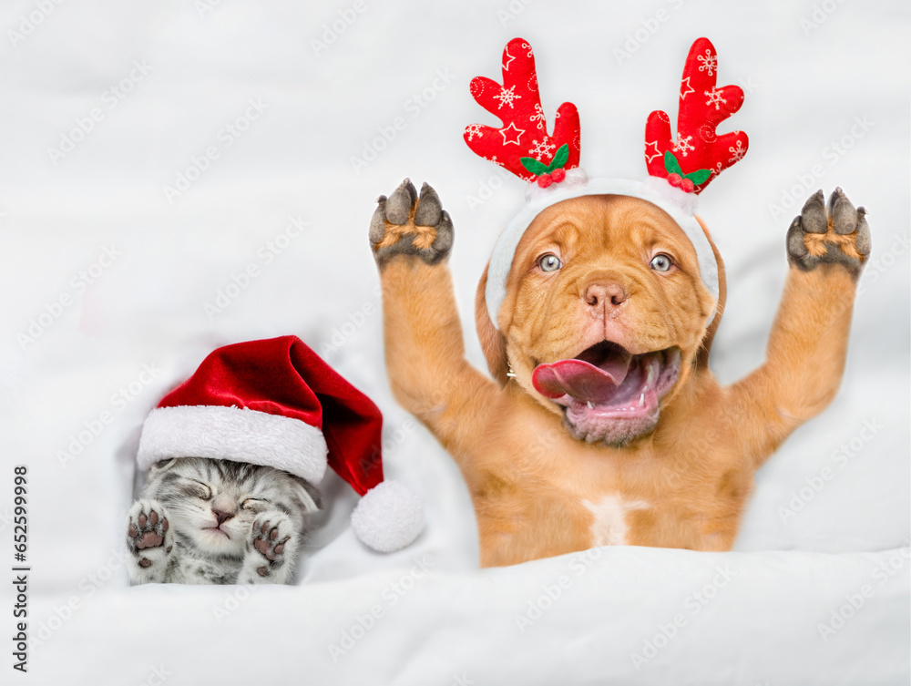 Happy mastiff puppy dressed like santa claus reindeer Rudolf lying with cozy kitten under white blanket at home. Top down view