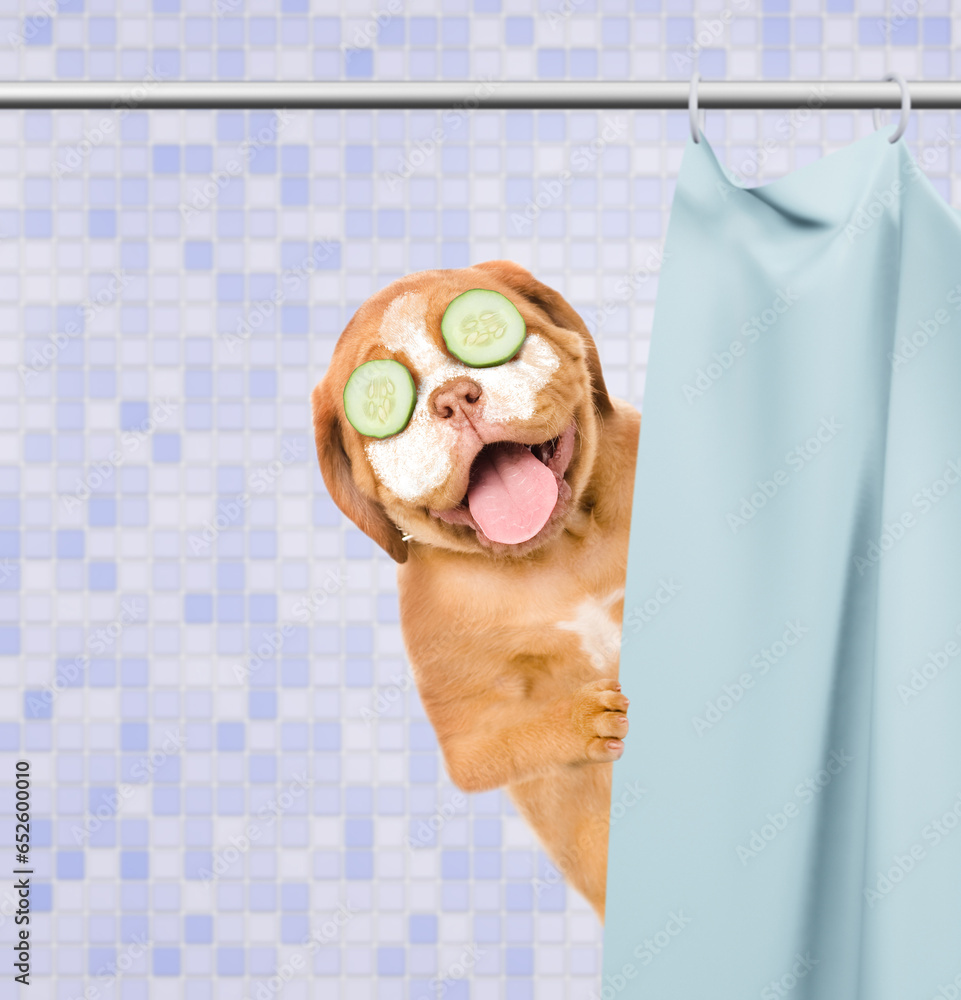 Happy Mastiff puppy with cream on it face and with pieces of cucumber on it eyes peeking out from behind the shower curtain in the bathroom at home