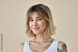 Smiling blond pretty smiling girl beauty female gen z model with short blonde hair beautiful face healthy skin and tattoo looking at camera wearing white top isolated at beige background. Portrait
