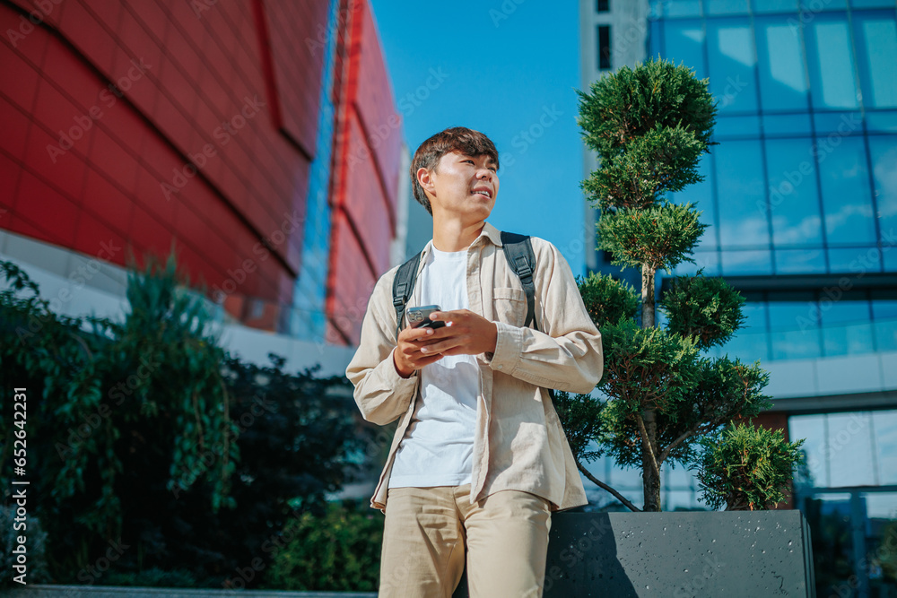 A portrait of a satisfied guy texting on his mobile phone, bathed in the warm sunlight. Lively Conversation Among Young People in Nature