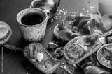 Traditional Spanish breakfast. Tostada with Jamon Iberico ham and tomatoes, olive oil bread with coffee. banner, menu, recipe place for text, top view
